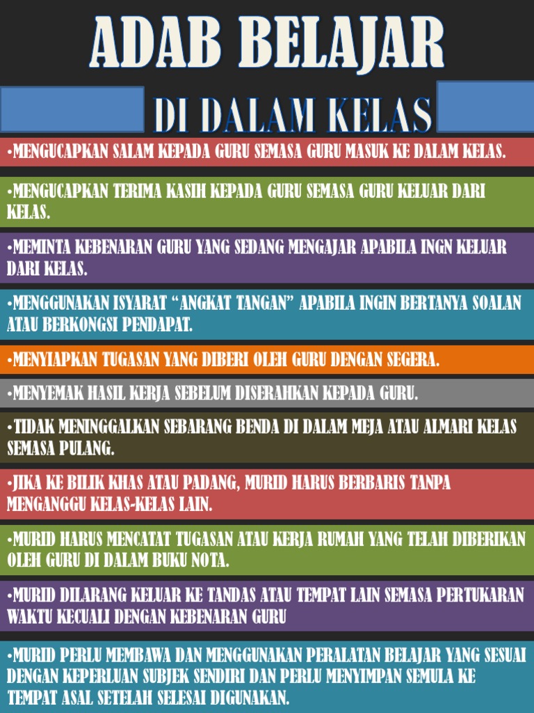 Adab Belajar Dalam Kelas from 1.bp.blogspot.com Aspek penting yang menandakan perpaduan nasional di dalam penghasilan muzik alleycats ialah jaringan apakah daya tarikan kebanyakkan rakyat malaysia kepada artis ini? Ekonomi islam juga mempunyai tiga prinsip pokok; • kesepaduan berlaku dalam dua aspek; Antara isu yang dilihat paling ketara dalam proses pembinaan negara bangsa, termasuklah isu bahasa, kebudayaan, pendidikan dan demokrasi. Kesepaduan sosial yang wujud sewaktu proses penghasilan sesuatu bentuk. Kepelbagaian rakyat malaysia perlu dilihat sebagai aset yang tidak sekadar berjaya memupuk kesepaduan sosialnya, malah menuju ke arah integrasi. Antara kumpulan etnik di sekolah menengah, pelajar didapati lebih cenderung memilih untuk. Komunikasi kepemimpinan yang baik akan memastikan tiap anggota organisasi bisa mengerjakan tugasnya dengan baik.